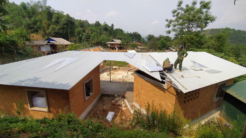Mặc cho khó khăn về địa hình hay thời tiết khắc nghiệt đội ngũ thi công cùng các thầy cô, đồng bào vùng bản đã cùng nhau cố gắng, chung tay hoàn thiện từng công đoạn. Chúng tôi sử dụng dòng sản phẩm tôn lạnh màu Pomina AZ50 màu trắng sữa cho phần mái công trình. Dòng tôn có lớp sơn siêu mịn, bền chắc giúp bề mặt sáng, bền màu và có khả năng chống ăn mòn cao thích hợp với điều kiện thời tiết nhiệt đới gió mùa núi cao, đặc tính khí hậu diễn biến thất thường.
