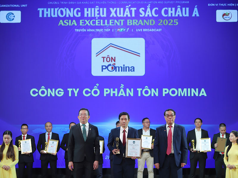 Ngày 28/6, tại buổi truyền hình trực tiếp trên kênh truyền thông HTV, Công ty Cổ phần Tôn Pomina được vinh danh trong Top 10 Thương hiệu Xuất sắc châu Á 2025 – giải thưởng thường niên do Viện Nghiên cứu Kinh tế châu Á phối hợp cùng Liên hiệp Khoa học Phát triển Doanh nghiệp Việt Nam tổ chức.
