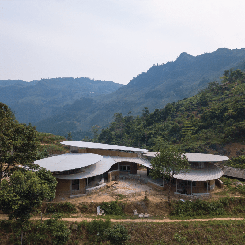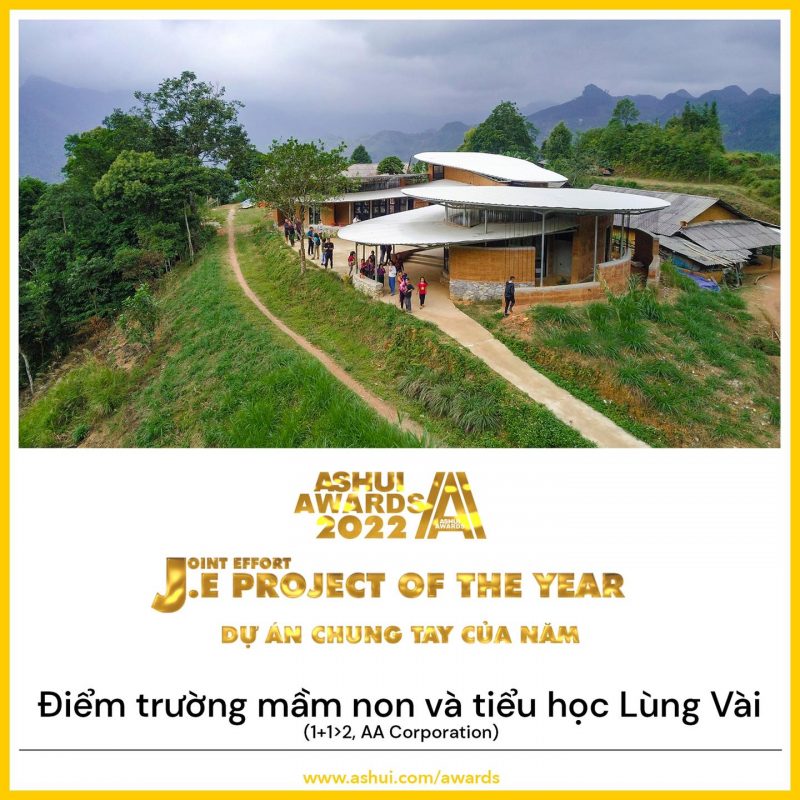 The school building, designed and constructed by the 1+1>2 architectural office with charitable funding from AA Corporation (Ho Chi Minh City), covers an area of 600m2 and includes 3 classrooms, 1 teacher’s lounge, 1 kitchen, restrooms, a playground, and learning materials.