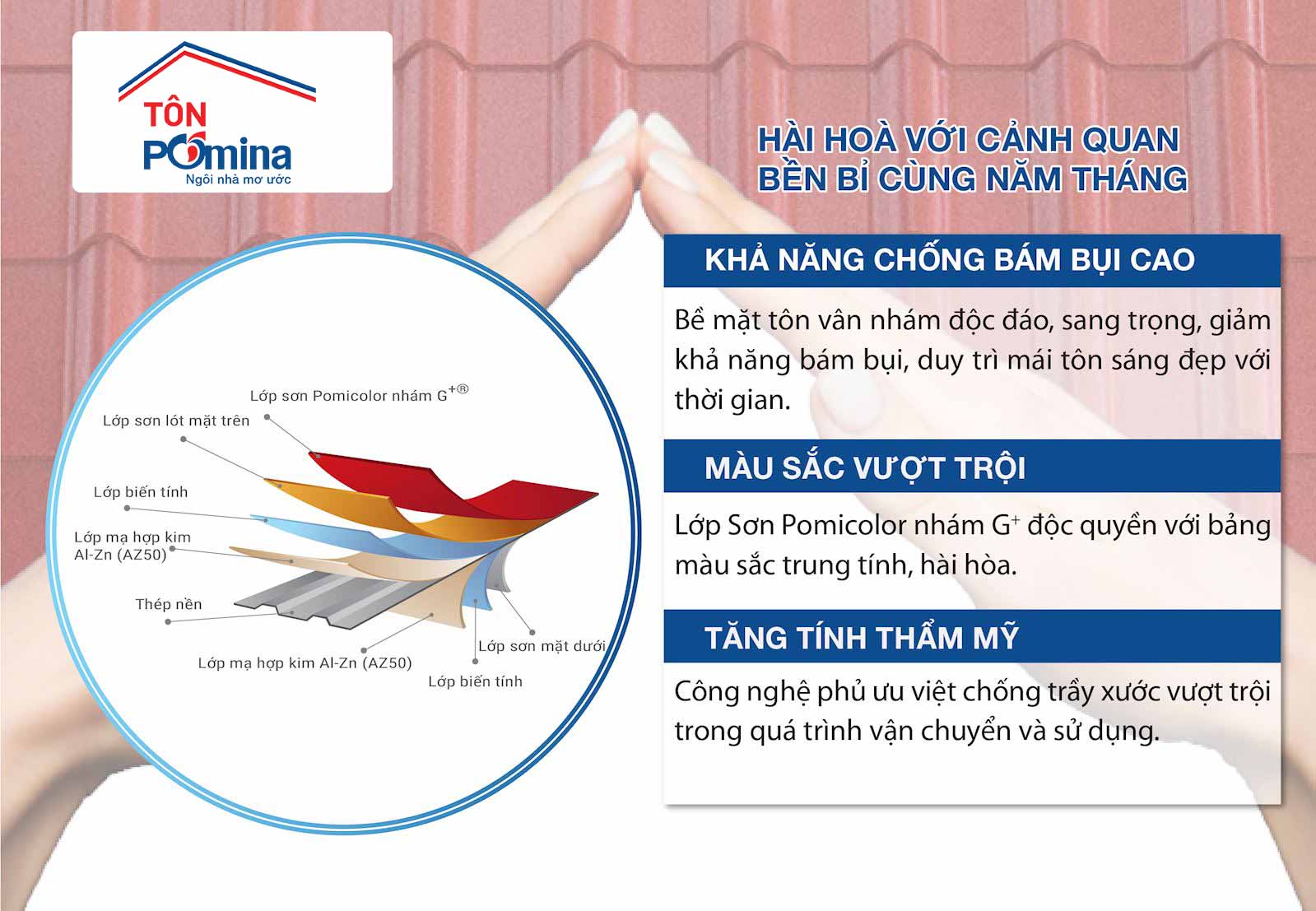 Đặc biệt, bề mặt tôn sáng nhờ lớp sơn phủ độc quyền PomiColor Công ty G + do Công ty Tôn Pomina cùng Tập đoàn AkzoNobel hợp tác, tạo vân tôn sáng độc đáo, độ bóng vừa phải mang lại tính chất thẩm mỹ cao khi cán bộ sóng, mang đến vẻ đẹp chân thực, sang trọng cho công trình, nhìn từ xa nhiều người còn khó phân biệt là ngói hoặc tôn sóng ngói. Điểm ưu tiên trên giúp tôn sáng hiệu quả trong quá trình chuyển đổi cũng như sử dụng.